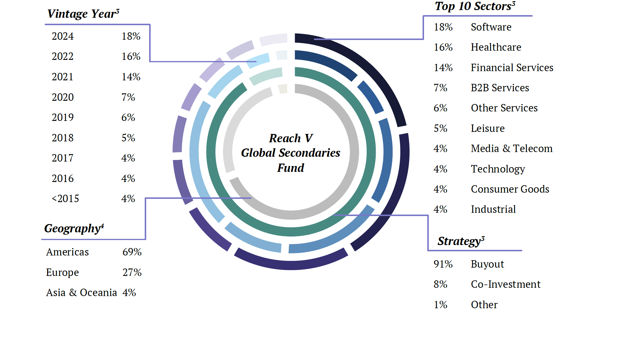 Through the Reach V Global Secondaries Fund, you’re invested in a fund built to accelerate your private markets portfolio, offering earlier liquidity, j-curve mitigation and reduced blind-pool risk. The Fund primarily partners with specialised secondary managers who acquire Limited Partner (LP) interests in established private equity funds, while also selectively acquiring LP interests directly, giving you exposure to a broad pool of mature companies and assets. This structure offers meaningful diversification across sectors, geographies, and fund vintages, benefiting from the expertise of seasoned global secondary managers including Ardian and other global managers.